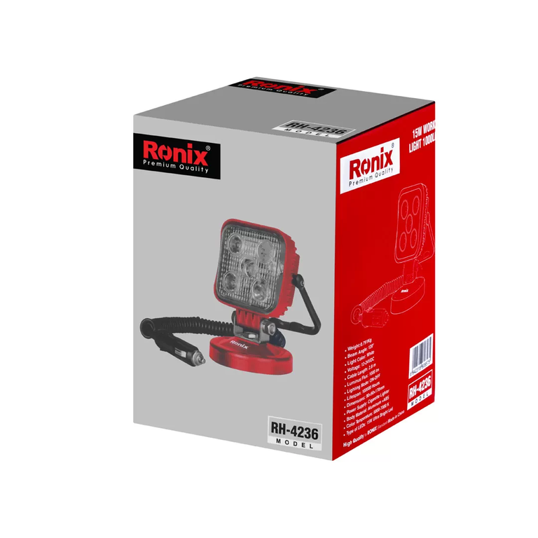 چراغ روشنایی RH-4236 رونیکس در محدوده ولتاژ ۱۲ تا ۲۴ ولت DC و با اتصال به فندکی خودرو کار میکند. این چراغ روشنایی، دارای LED مهتابی ۱۵ وات فوقالعاده روشن، حداکثر شار روشنایی آن، ۱۰۰۰ لومن و طول عمر کارکرد ۱۰۰ هزار ساعت است.